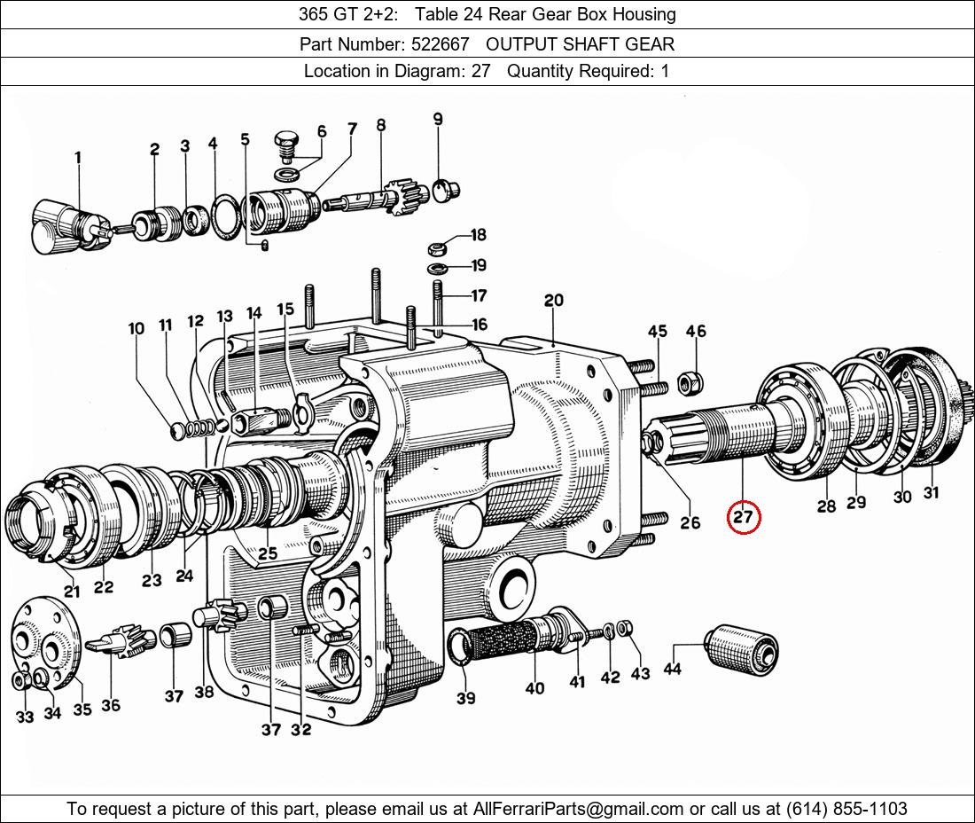 Ferrari Part Number 522667, OUTPUT SHAFT GEAR shown here as used in 365 GT 2+2 Table 24 Rear Gear Box Housing. Location in Diagram: 27. Required Quantity: 1