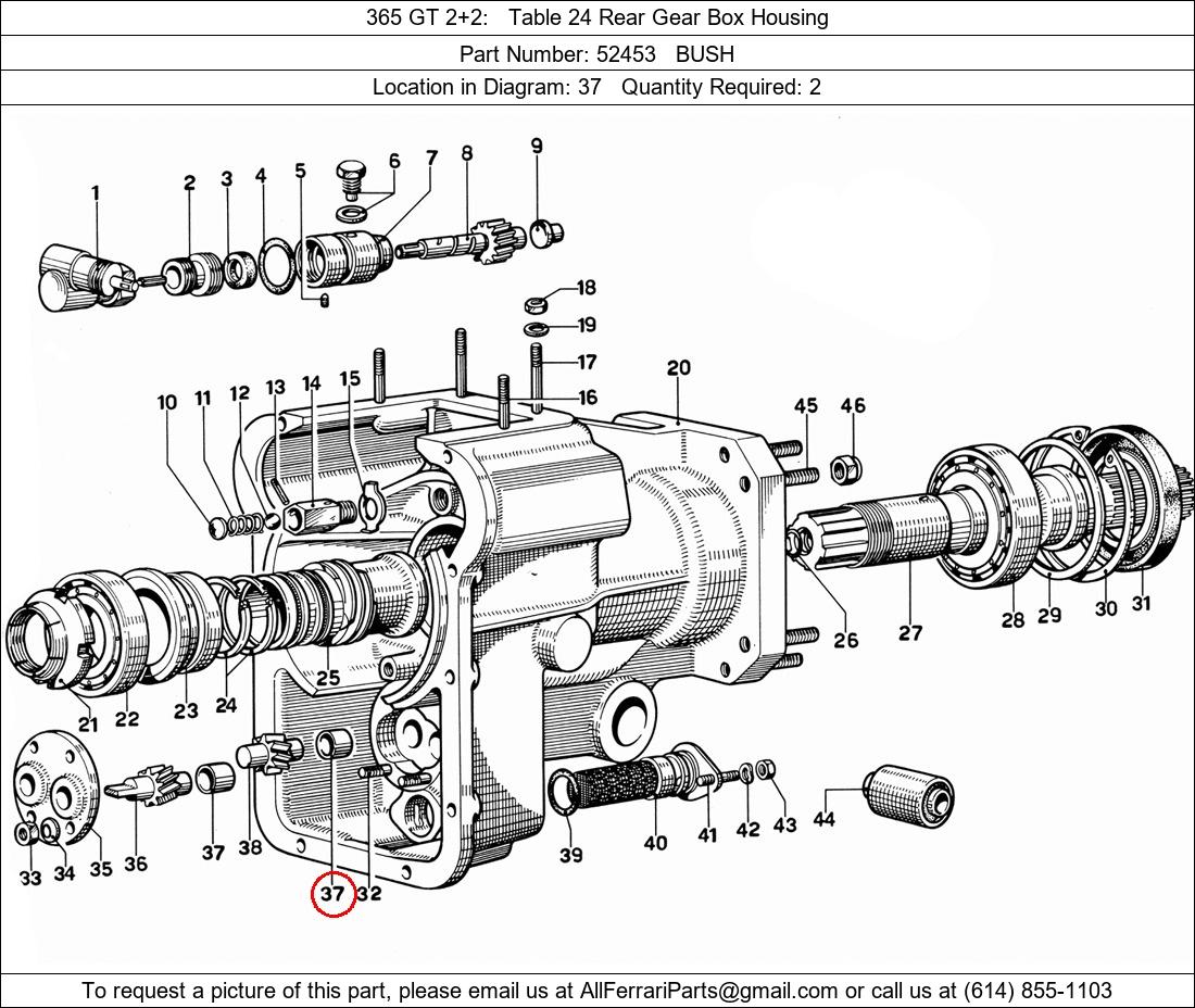 Ferrari Part Number 52453, BUSH shown here as used in 365 GT 2+2 Table 24 Rear Gear Box Housing. Location in Diagram: 37. Required Quantity: 2. This Ferrari part is used in more than one diagram. Click on the diagrams below to see alternative uses of this part: