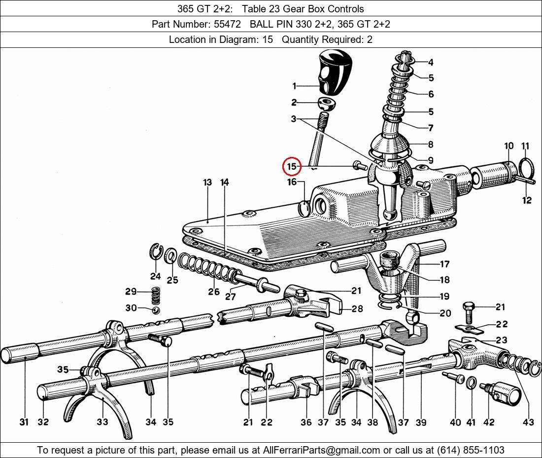Ferrari Part Number 55472, BALL PIN 330 2+2, 365 GT 2+2 shown here as used in 365 GT 2+2 Table 23 Gear Box Controls. Location in Diagram: 15. Required Quantity: 2. This Ferrari part is used in more than one diagram. Click on the diagrams below to see alternative uses of this part: