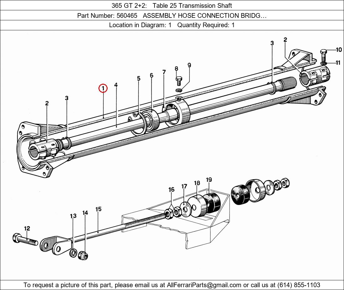 Ferrari Part Number 560465, ASSEMBLY HOSE CONNECTION BRIDG… shown here as used in 365 GT 2+2 Table 25 Transmission Shaft. Location in Diagram: 1. Required Quantity: 1