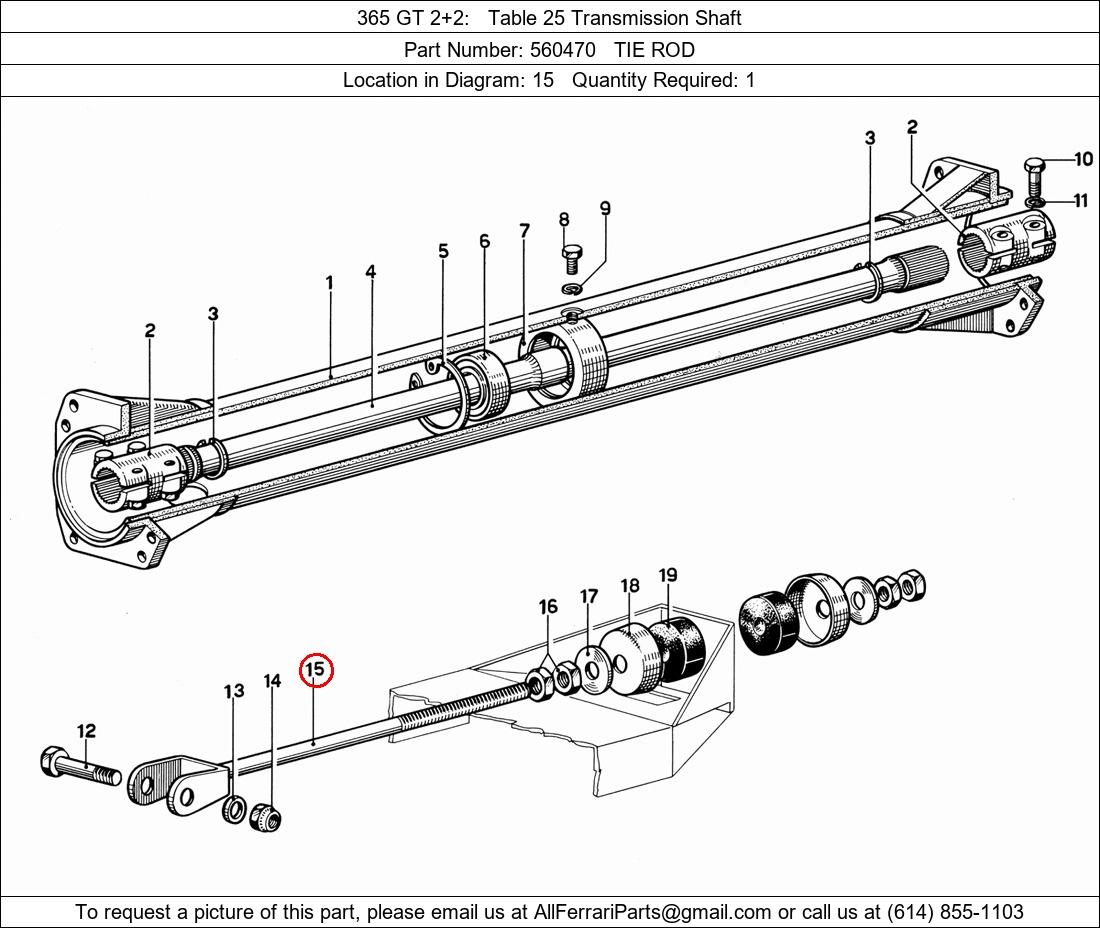 Ferrari Part Number 560470, TIE ROD shown here as used in 365 GT 2+2 Table 25 Transmission Shaft. Location in Diagram: 15. Required Quantity: 1