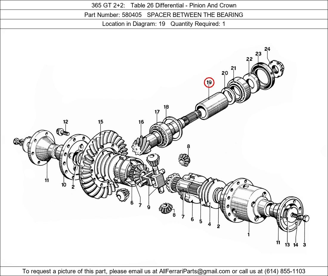 Ferrari Part Number 580405, SPACER BETWEEN THE BEARING shown here as used in 365 GT 2+2 Table 26 Differential - Pinion And Crown. Location in Diagram: 19. Required Quantity: 1