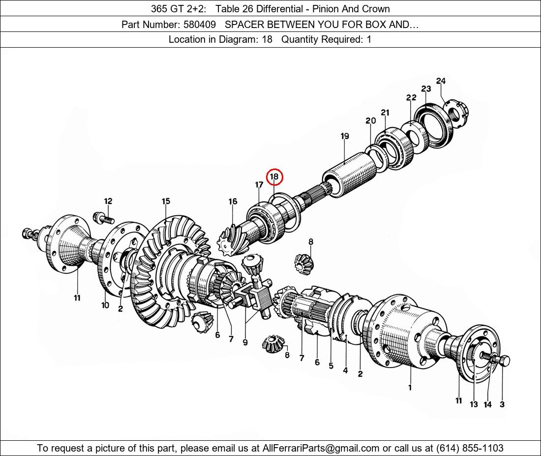 Ferrari Part Number 580409, SPACER BETWEEN YOU FOR BOX AND… shown here as used in 365 GT 2+2 Table 26 Differential - Pinion And Crown. Location in Diagram: 18. Required Quantity: 1