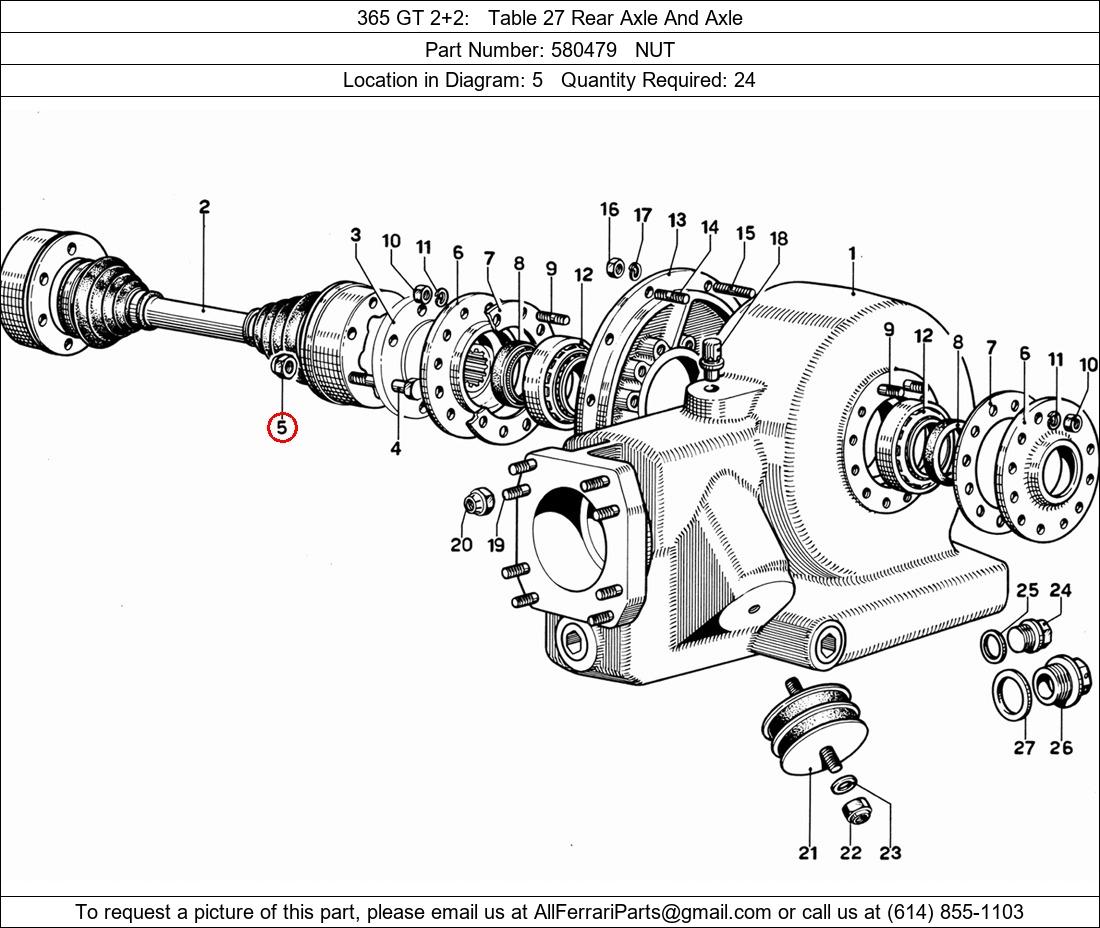Ferrari Part Number 580479, NUT shown here as used in 365 GT 2+2 Table 27 Rear Axle And Axle. Location in Diagram: 5. Required Quantity: 24. This Ferrari part is used in more than one diagram. Click on the diagrams below to see alternative uses of this part: