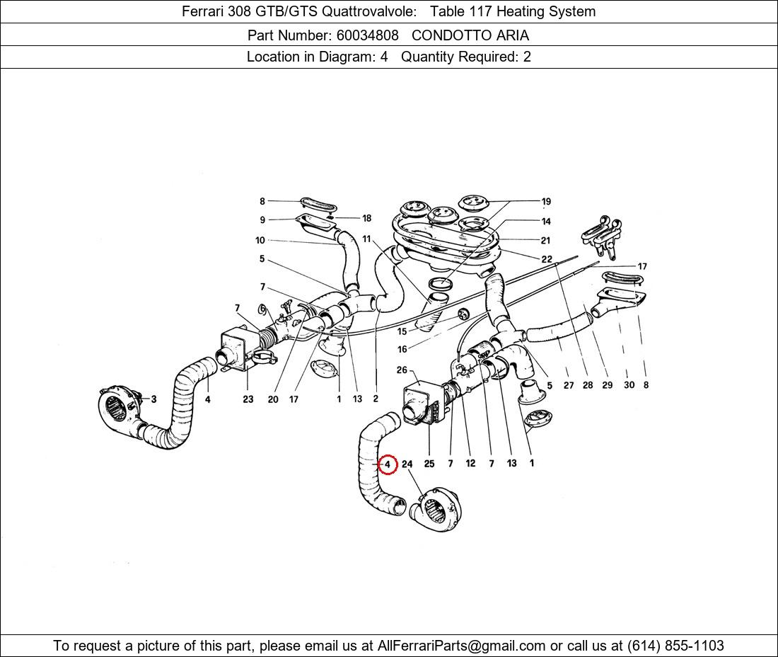 Ferrari Part Number 60034808, CONDOTTO ARIA shown here as used in Ferrari 308 GTB/GTS Quattrovalvole Table 117 Heating System. Location in Diagram: 4. Required Quantity: 2. This Ferrari part is used in more than one diagram. Click on the diagrams below to see alternative uses of this part: