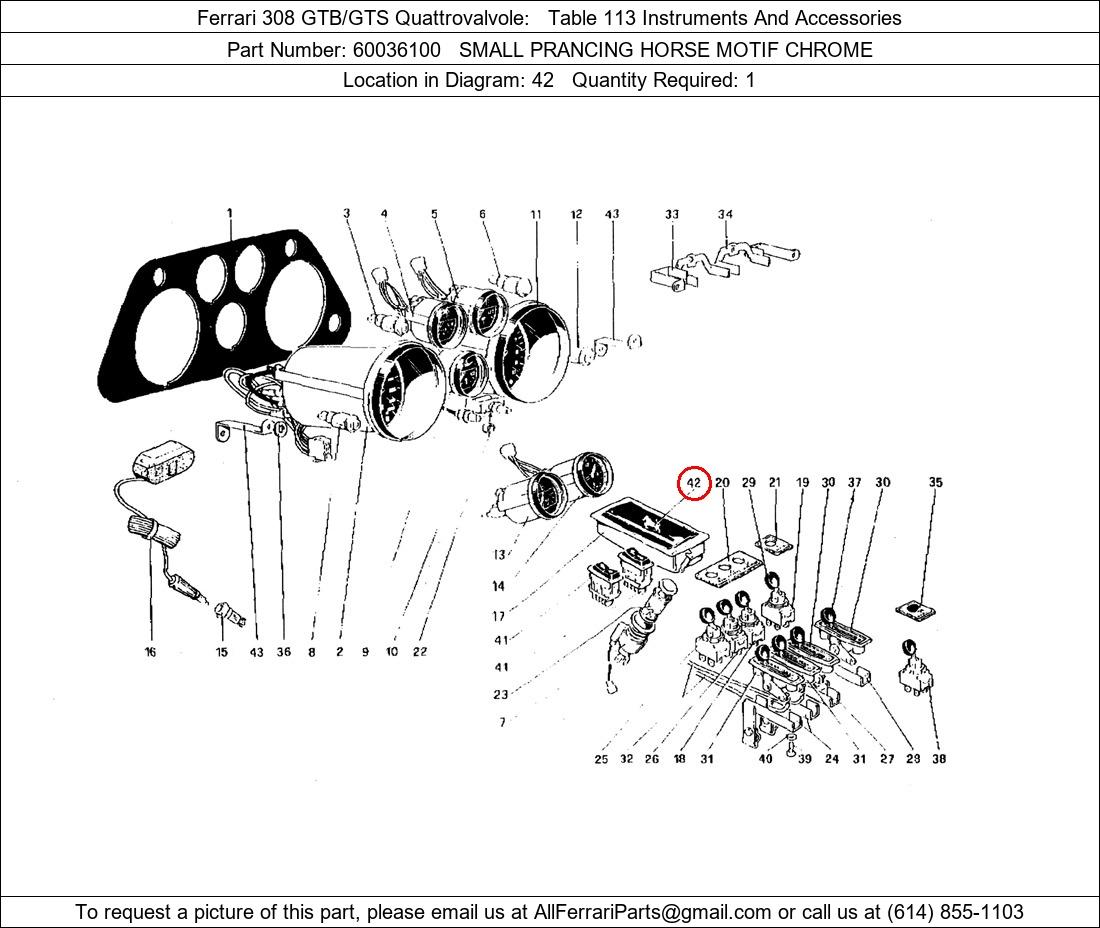 Ferrari Part Number 60036100, SMALL PRANCING HORSE MOTIF CHROME shown here as used in Ferrari 308 GTB/GTS Quattrovalvole Table 113 Instruments And Accessories. Location in Diagram: 42. Required Quantity: 1. This Ferrari part is used in more than one diagram. Click on the diagrams below to see alternative uses of this part: