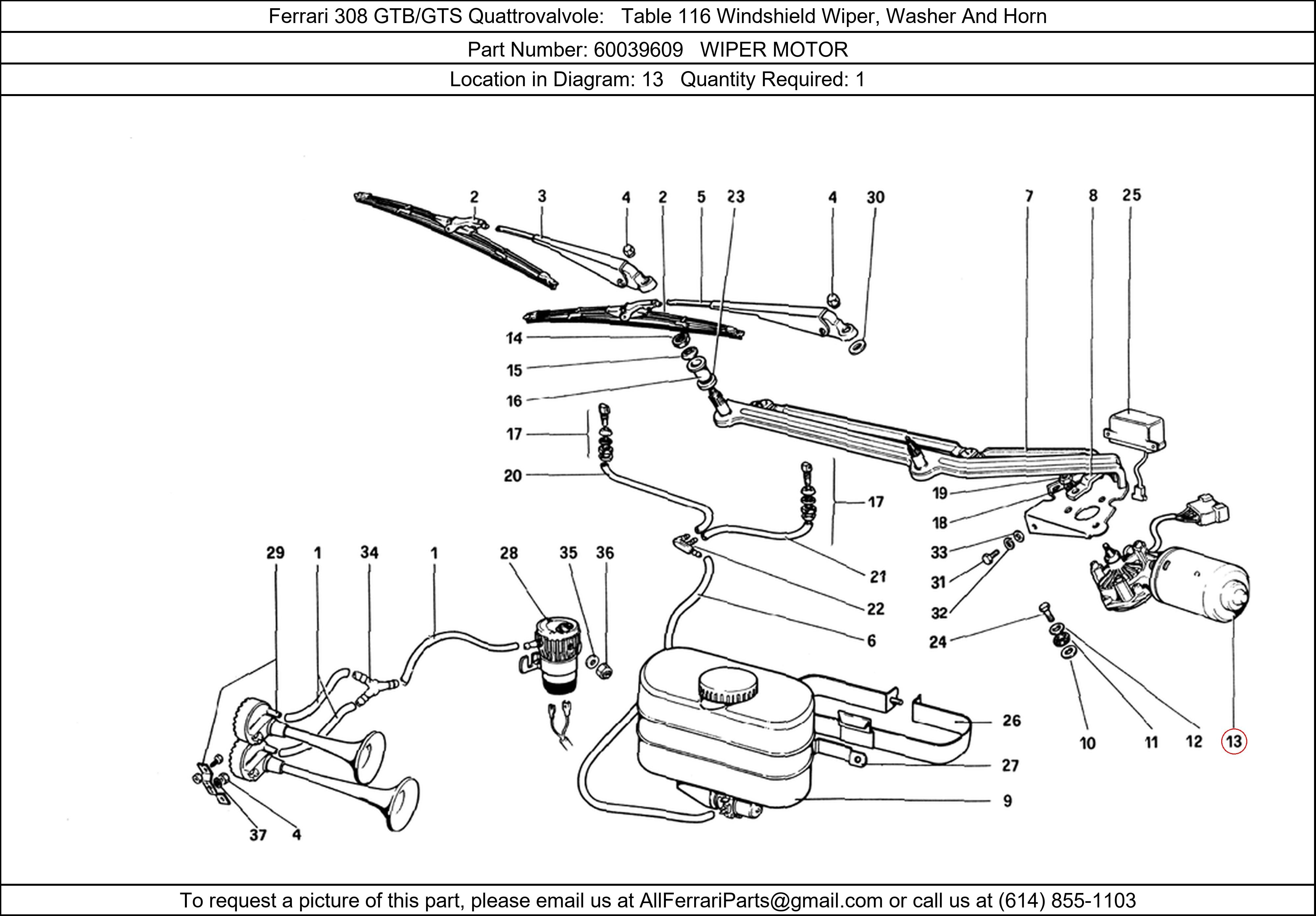 Ferrari Part Number 60039609, WIPER MOTOR shown here as used in Ferrari 308 GTB/GTS Quattrovalvole Table 116 Windshield Wiper, Washer And Horn. Location in Diagram: 13. Required Quantity: 1. This Ferrari part is used in more than one diagram. Click on the diagrams below to see alternative uses of this part: