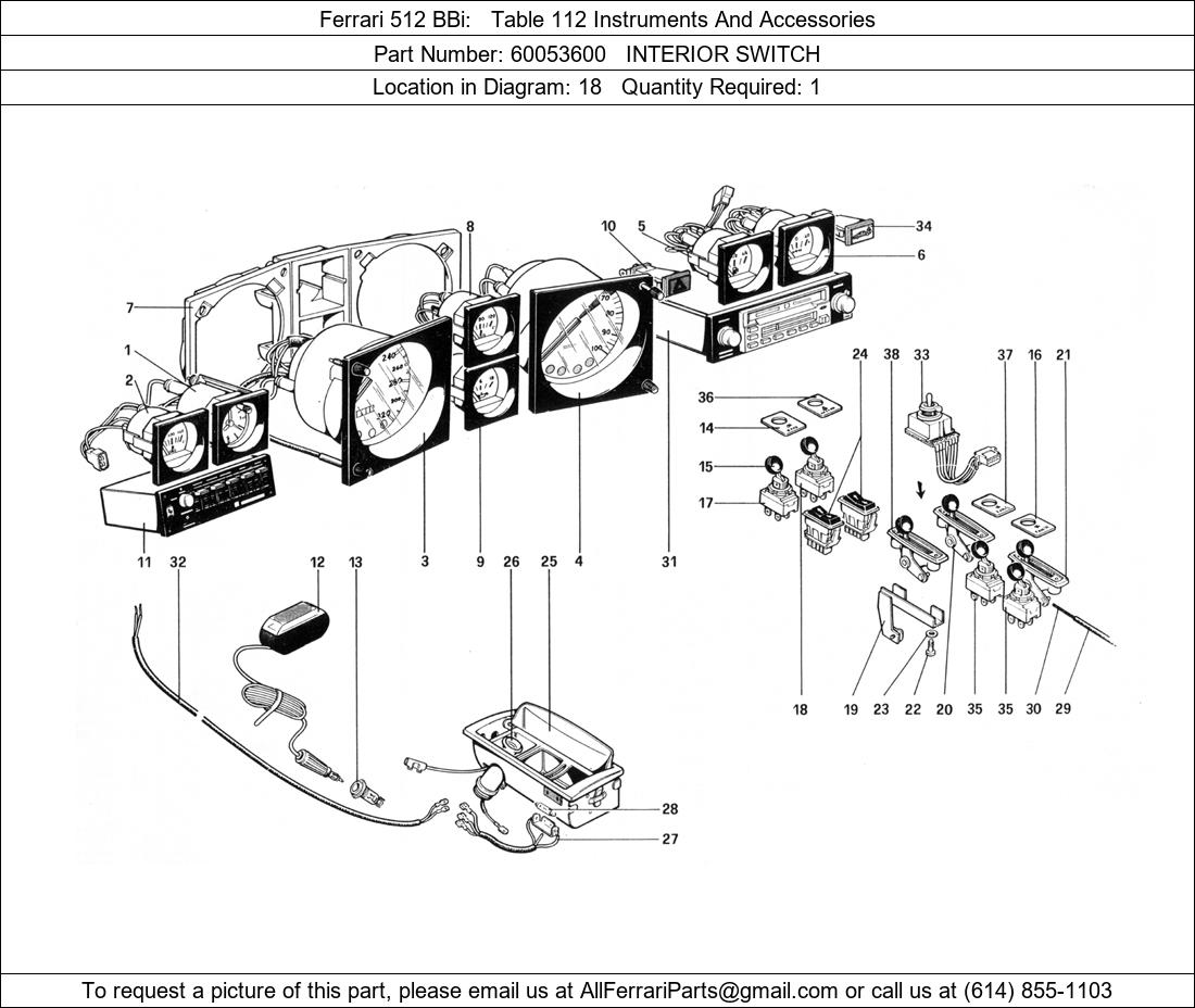 Ferrari Part 60053600, INTERIOR SWITCH, shown here as used in Ferrari 512 BBi Table 112 Instruments And Accessories. Other uses of this part are shown below: