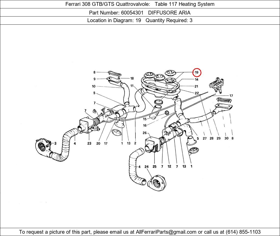 Ferrari Part Number 60054301, DIFFUSORE ARIA shown here as used in Ferrari 308 GTB/GTS Quattrovalvole Table 117 Heating System. Location in Diagram: 19. Required Quantity: 3. This Ferrari part is used in more than one diagram. Click on the diagrams below to see alternative uses of this part: