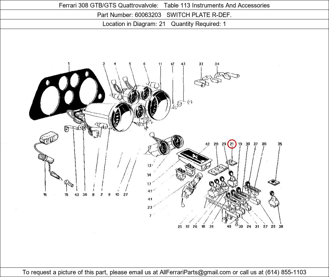 Ferrari Part Number 60063203, SWITCH PLATE R-DEF. shown here as used in Ferrari 308 GTB/GTS Quattrovalvole Table 113 Instruments And Accessories. Location in Diagram: 21. Required Quantity: 1. This Ferrari part is used in more than one diagram. Click on the diagrams below to see alternative uses of this part: