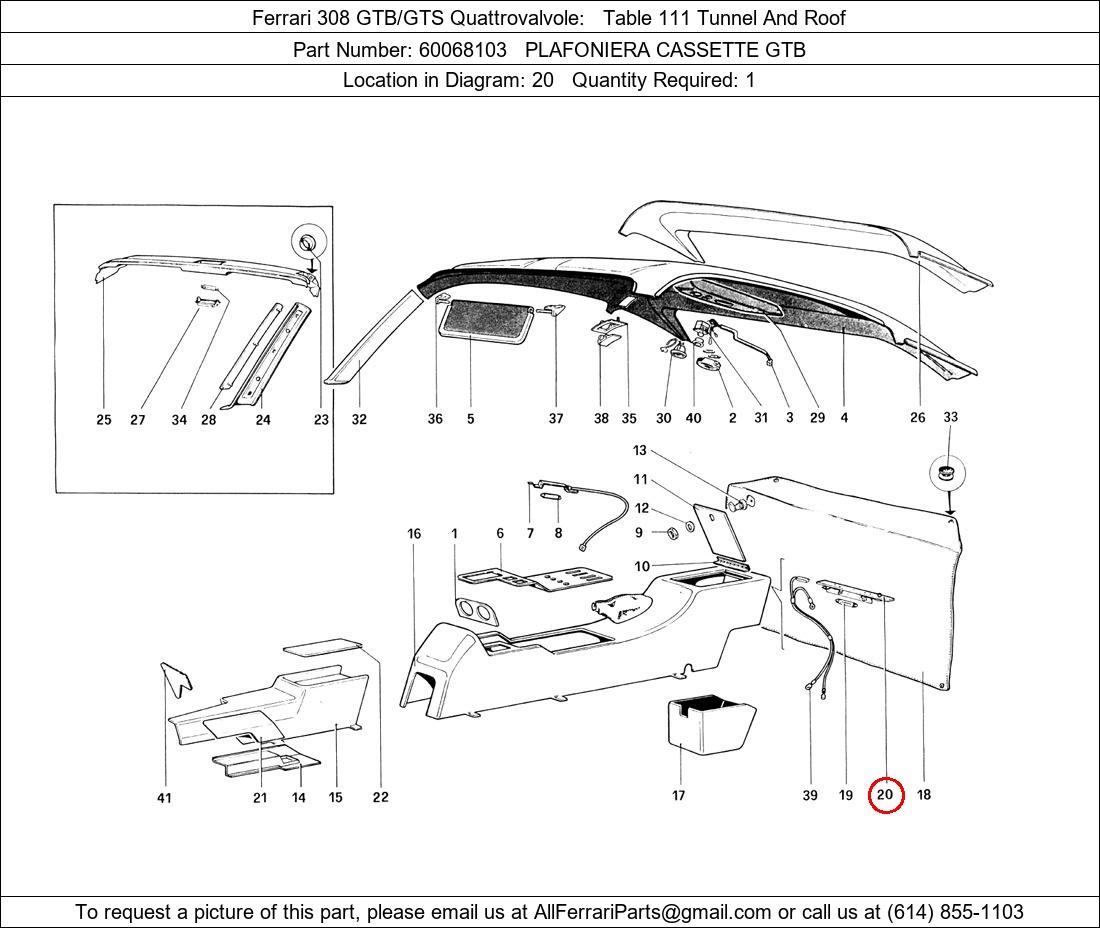 Ferrari Part Number 60068103, PLAFONIERA CASSETTE GTB shown here as used in Ferrari 308 GTB/GTS Quattrovalvole Table 111 Tunnel And Roof. Location in Diagram: 20. Required Quantity: 1. This Ferrari part is used in more than one diagram. Click on the diagrams below to see alternative uses of this part: