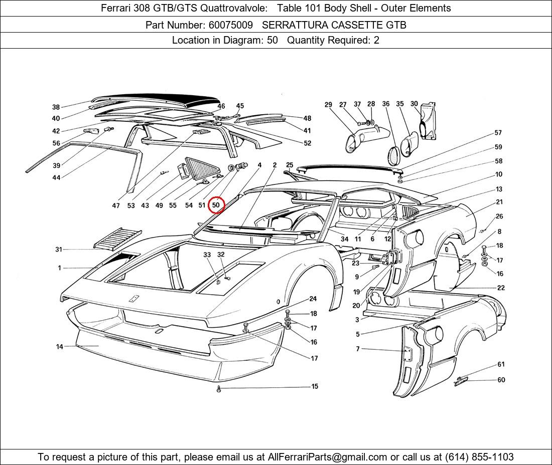 Ferrari Part Number 60075009, SERRATTURA CASSETTE GTB shown here as used in Ferrari 308 GTB/GTS Quattrovalvole Table 101 Body Shell - Outer Elements. Location in Diagram: 50. Required Quantity: 2. This Ferrari part is used in more than one diagram. Click on the diagrams below to see alternative uses of this part:
