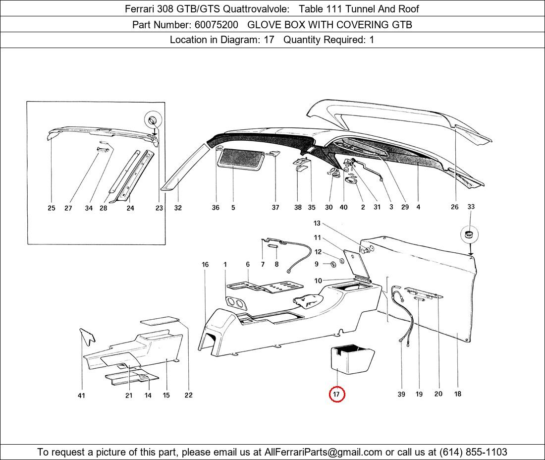 Ferrari Part Number 60075200, GLOVE BOX WITH COVERING GTB shown here as used in Ferrari 308 GTB/GTS Quattrovalvole Table 111 Tunnel And Roof. Location in Diagram: 17. Required Quantity: 1