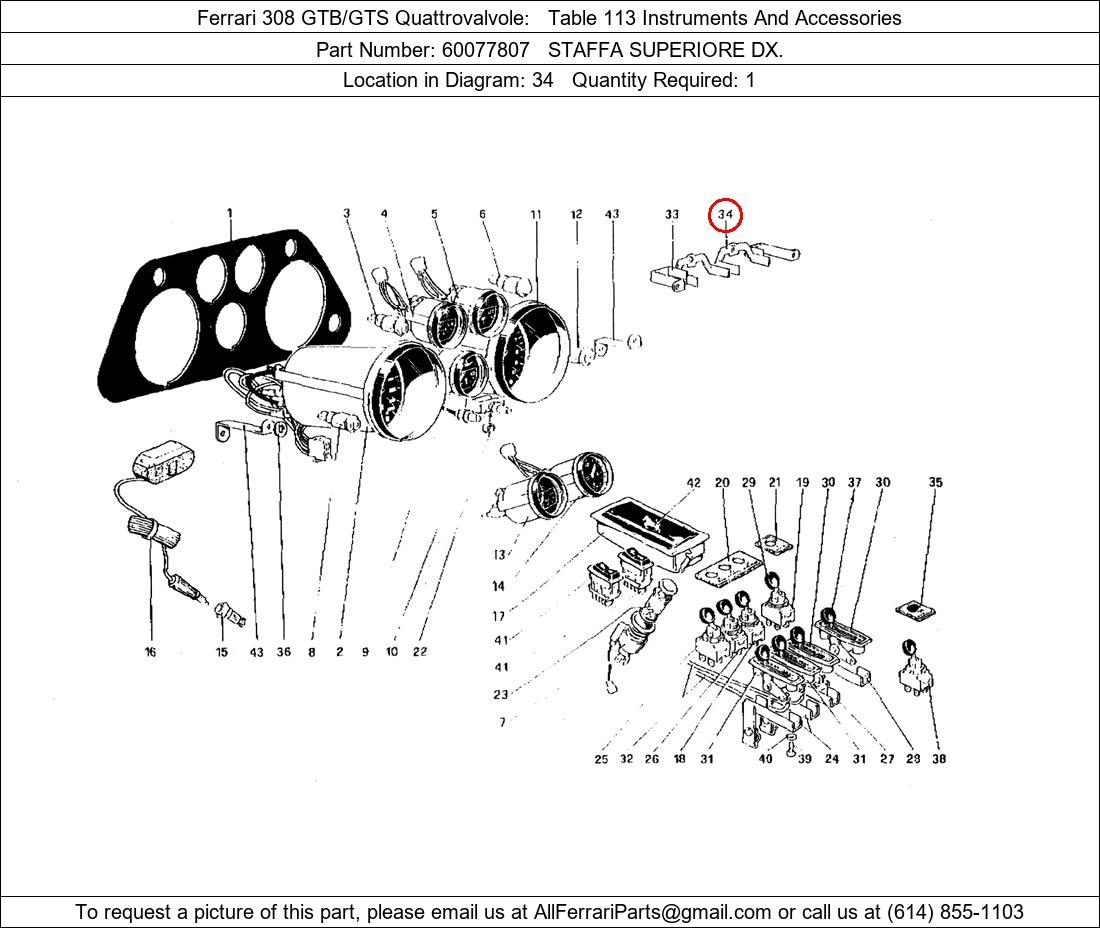 Ferrari Part Number 60077807, STAFFA SUPERIORE DX. shown here as used in Ferrari 308 GTB/GTS Quattrovalvole Table 113 Instruments And Accessories. Location in Diagram: 34. Required Quantity: 1. This Ferrari part is used in more than one diagram. Click on the diagrams below to see alternative uses of this part: