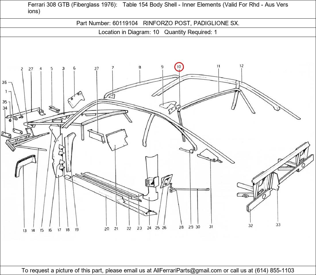 Ferrari Part Number 60119104, RINFORZO POST, PADIGLIONE SX. shown here as used in Ferrari 308 GTB (Fiberglass 1976) Table 154 Body Shell - Inner Elements (Valid For Rhd - Aus Versions). Location in Diagram: 10. Required Quantity: 1. This Ferrari part is used in more than one diagram. Click on the diagrams below to see alternative uses of this part: