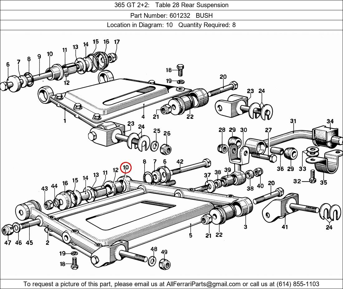 Ferrari Part Number 601232, BUSH shown here as used in 365 GT 2+2 Table 28 Rear Suspension. Location in Diagram: 10. Required Quantity: 8