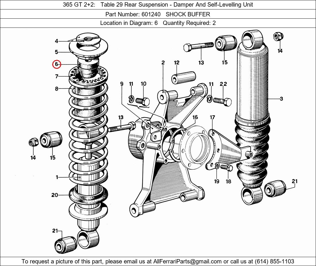Ferrari Part Number 601240, SHOCK BUFFER shown here as used in 365 GT 2+2 Table 29 Rear Suspension - Damper And Self-Levelling Unit. Location in Diagram: 6. Required Quantity: 2