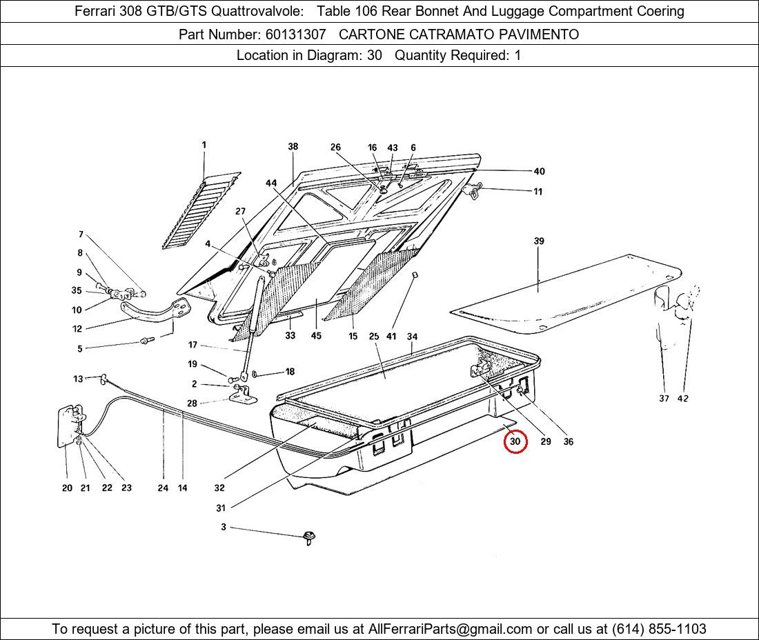 Ferrari Part Number 60131307, CARTONE CATRAMATO PAVIMENTO shown here as used in Ferrari 308 GTB/GTS Quattrovalvole Table 106 Rear Bonnet And Luggage Compartment Coering. Location in Diagram: 30. Required Quantity: 1. This Ferrari part is used in more than one diagram. Click on the diagrams below to see alternative uses of this part:
