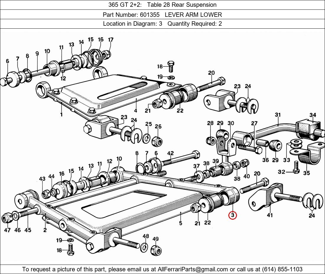 Ferrari Part Number 601355, LEVER ARM LOWER shown here as used in 365 GT 2+2 Table 28 Rear Suspension. Location in Diagram: 3. Required Quantity: 2