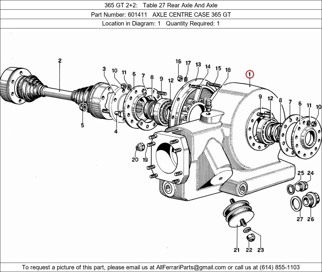 Ferrari Part Number 601411, AXLE CENTRE CASE 365 GT shown here as used in 365 GT 2+2 Table 27 Rear Axle And Axle. Location in Diagram: 1. Required Quantity: 1