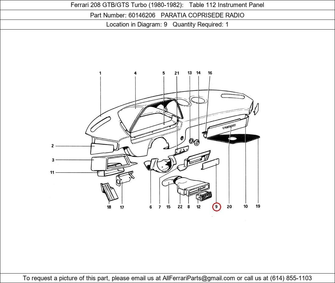 Ferrari Part Number 60146206, PARATIA COPRISEDE RADIO shown here as used in Ferrari 208 GTB/GTS Turbo (1980-1982) Table 112 Instrument Panel. Location in Diagram: 9. Required Quantity: 1. This Ferrari part is used in more than one diagram. Click on the diagrams below to see alternative uses of this part: