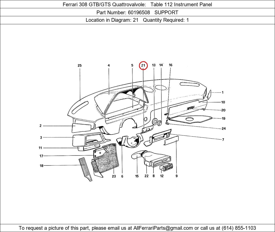 Ferrari Part Number 60196508, SUPPORT shown here as used in Ferrari 308 GTB/GTS Quattrovalvole Table 112 Instrument Panel. Location in Diagram: 21. Required Quantity: 1. This Ferrari part is used in more than one diagram. Click on the diagrams below to see alternative uses of this part: