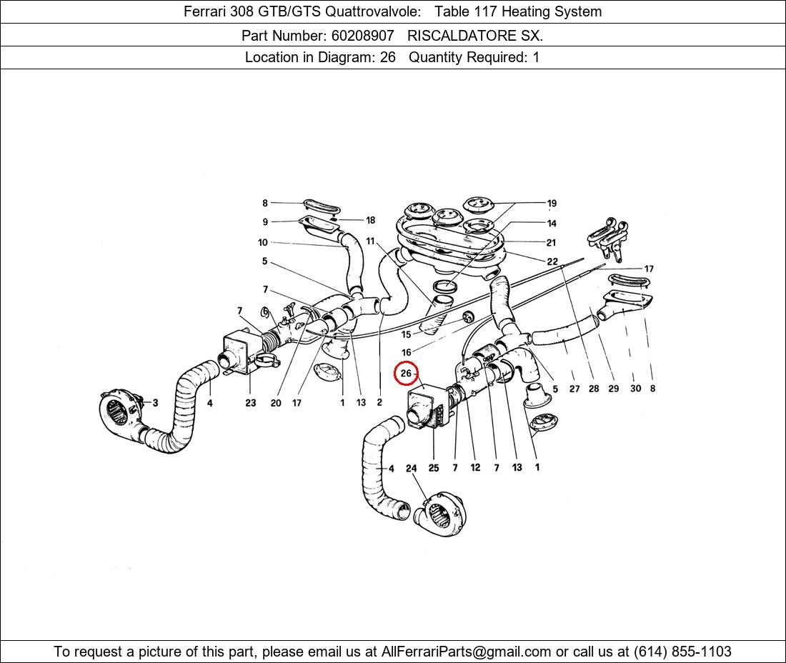 Ferrari Part Number 60208907, RISCALDATORE SX. shown here as used in Ferrari 308 GTB/GTS Quattrovalvole Table 117 Heating System. Location in Diagram: 26. Required Quantity: 1. This Ferrari part is used in more than one diagram. Click on the diagrams below to see alternative uses of this part: