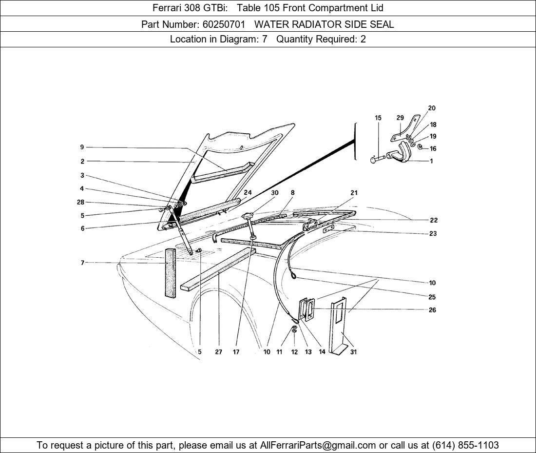 Ferrari Part 60250701, WATER RADIATOR SIDE SEAL, shown here as used in Ferrari 308 GTBi Table 105 Front Compartment Lid. Other uses of this part are shown below: