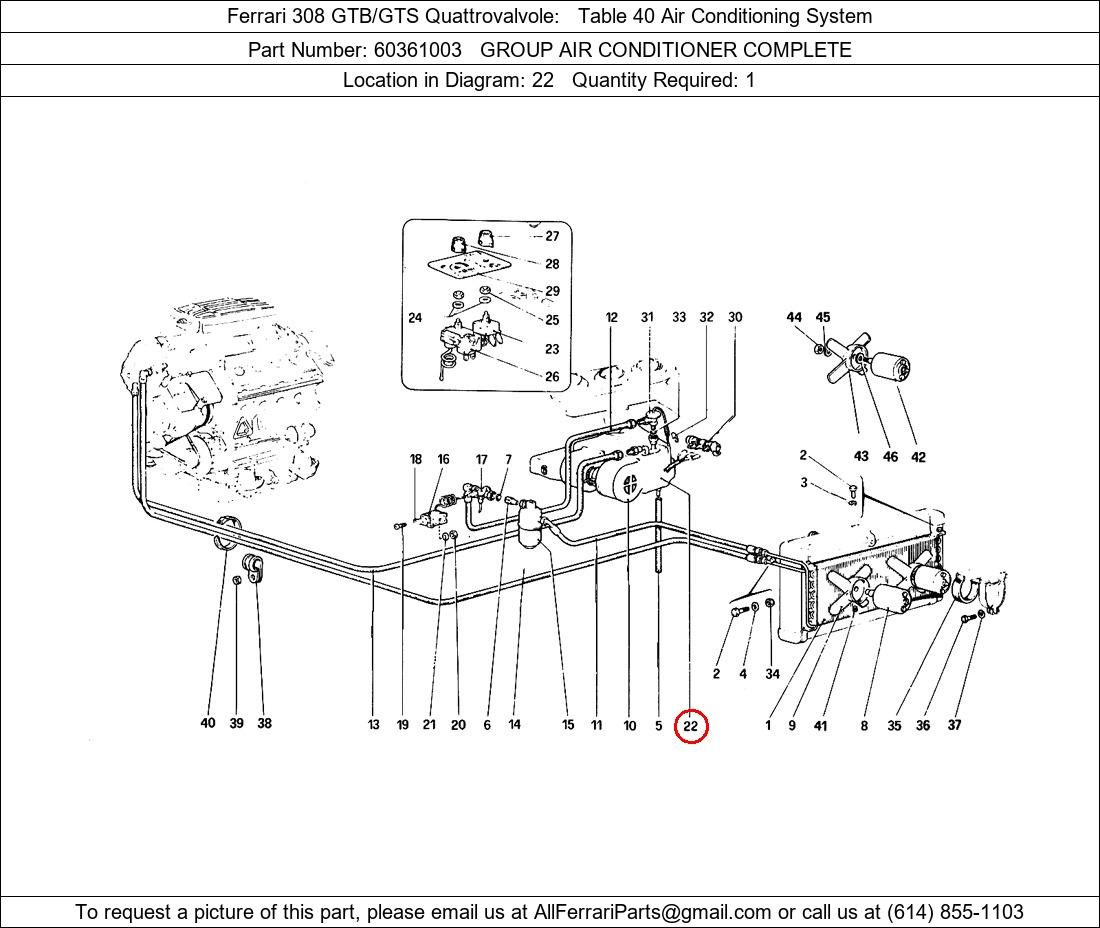Ferrari Part Number 60361003, GROUP AIR CONDITIONER COMPLETE shown here as used in Ferrari 308 GTB/GTS Quattrovalvole Table 40 Air Conditioning System. Location in Diagram: 22. Required Quantity: 1. This Ferrari part is used in more than one diagram. Click on the diagrams below to see alternative uses of this part: