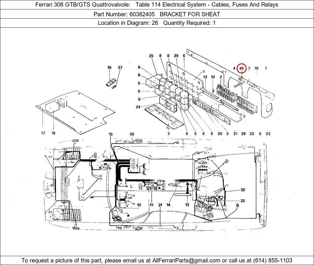 Ferrari Part Number 60382405, BRACKET FOR SHEAT shown here as used in Ferrari 308 GTB/GTS Quattrovalvole Table 114 Electrical System - Cables, Fuses And Relays. Location in Diagram: 26. Required Quantity: 1