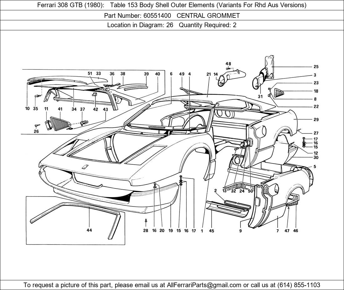 Ferrari Part 60551400, CENTRAL GROMMET, shown here as used in Ferrari 308 GTB (1980) Table 153 Body Shell Outer Elements (Variants For Rhd Aus Versions). Other uses of this part are shown below: