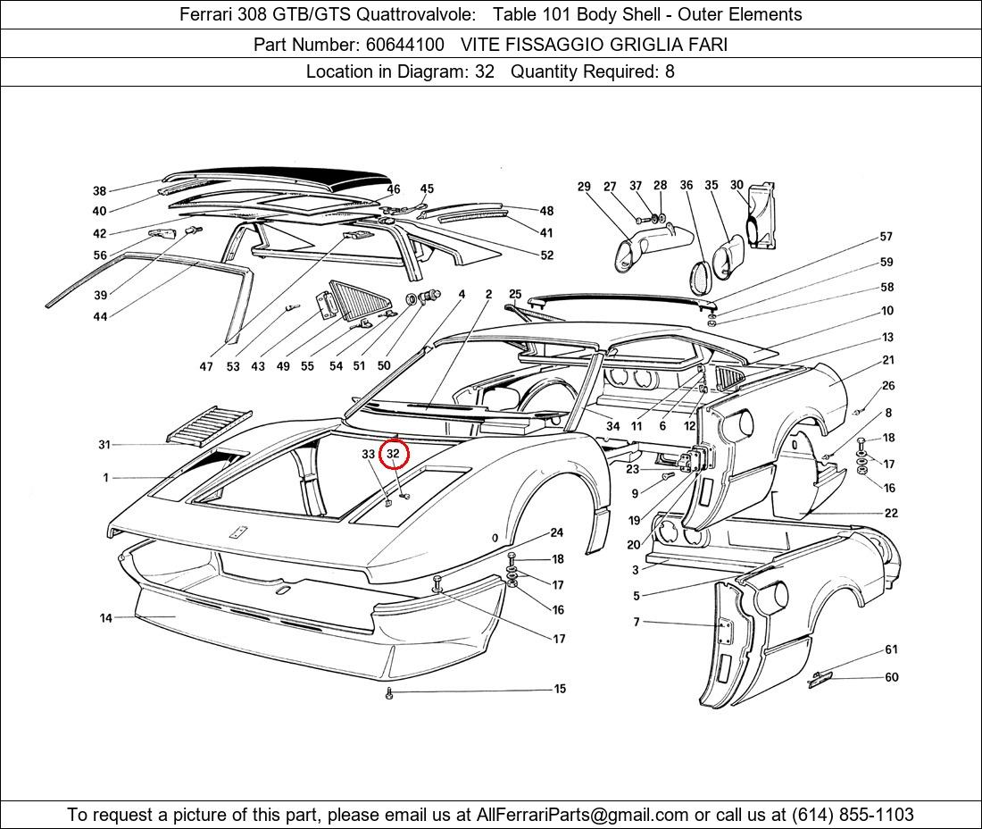 Ferrari Part Number 60644100, VITE FISSAGGIO GRIGLIA FARI shown here as used in Ferrari 308 GTB/GTS Quattrovalvole Table 101 Body Shell - Outer Elements. Location in Diagram: 32. Required Quantity: 8. This Ferrari part is used in more than one diagram. Click on the diagrams below to see alternative uses of this part: