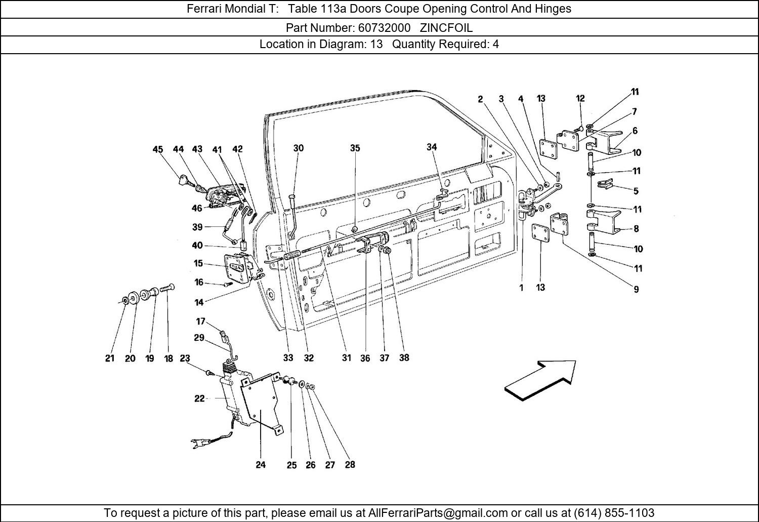 Ferrari Part 60732000, ZINCFOIL, shown here as used in Ferrari Mondial T Table 113a Doors Coupe Opening Control And Hinges. Other uses of this part are shown below: