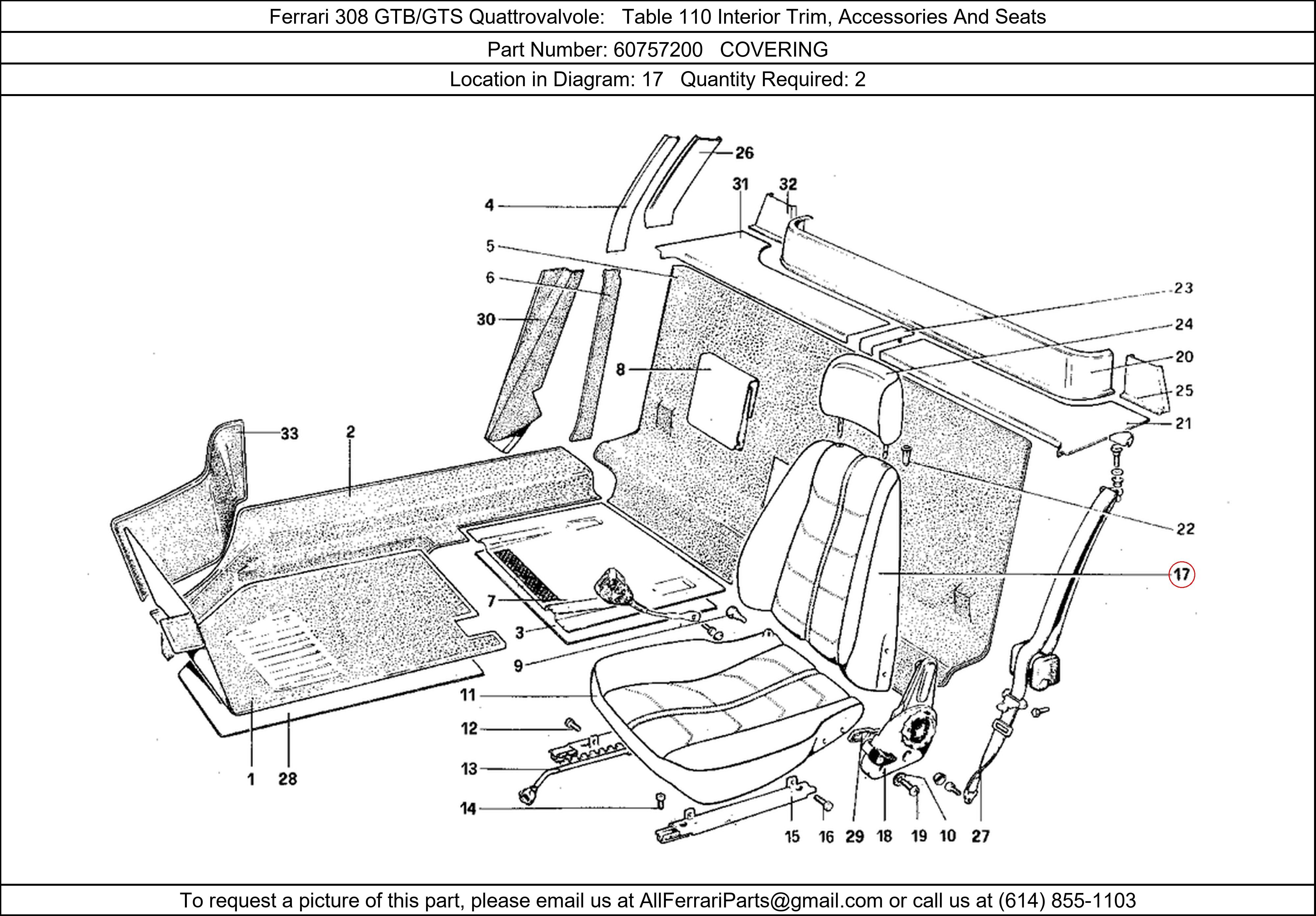 Ferrari Part Number 60757200, COVERING shown here as used in Ferrari 308 GTB/GTS Quattrovalvole Table 110 Interior Trim, Accessories And Seats. Location in Diagram: 17. Required Quantity: 2. This Ferrari part is used in more than one diagram. Click on the diagrams below to see alternative uses of this part: