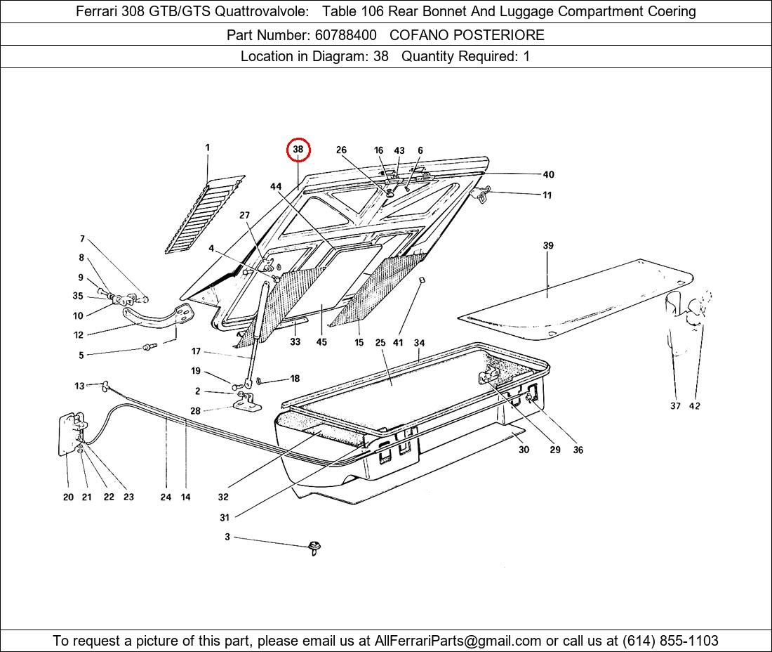 Ferrari Part Number 60788400, COFANO POSTERIORE shown here as used in Ferrari 308 GTB/GTS Quattrovalvole Table 106 Rear Bonnet And Luggage Compartment Coering. Location in Diagram: 38. Required Quantity: 1. This Ferrari part is used in more than one diagram. Click on the diagrams below to see alternative uses of this part: