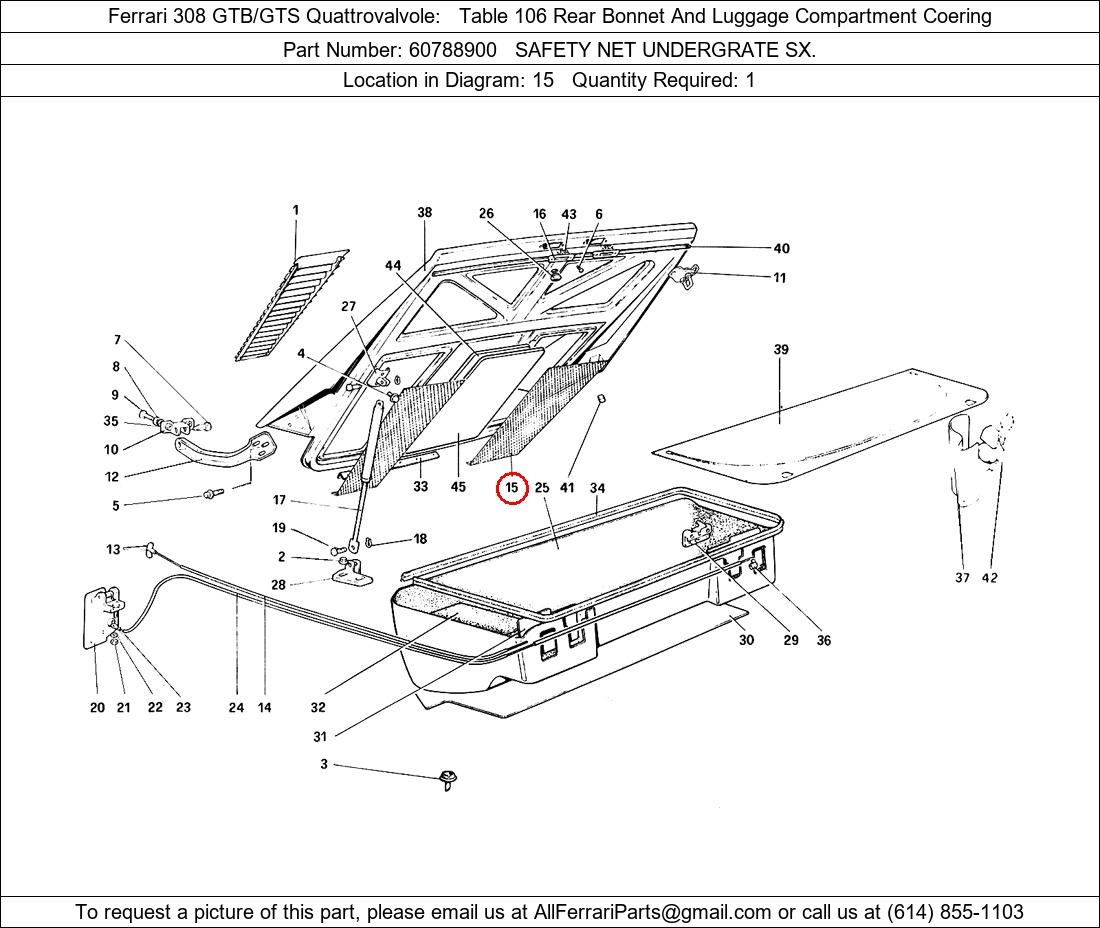 Ferrari Part Number 60788900, SAFETY NET UNDERGRATE SX. shown here as used in Ferrari 308 GTB/GTS Quattrovalvole Table 106 Rear Bonnet And Luggage Compartment Coering. Location in Diagram: 15. Required Quantity: 1. This Ferrari part is used in more than one diagram. Click on the diagrams below to see alternative uses of this part: