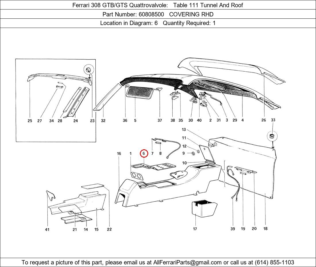 Ferrari Part Number 60808500, COVERING RHD shown here as used in Ferrari 308 GTB/GTS Quattrovalvole Table 111 Tunnel And Roof. Location in Diagram: 6. Required Quantity: 1