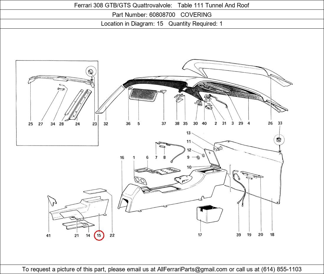 Ferrari Part Number 60808700, COVERING shown here as used in Ferrari 308 GTB/GTS Quattrovalvole Table 111 Tunnel And Roof. Location in Diagram: 15. Required Quantity: 1
