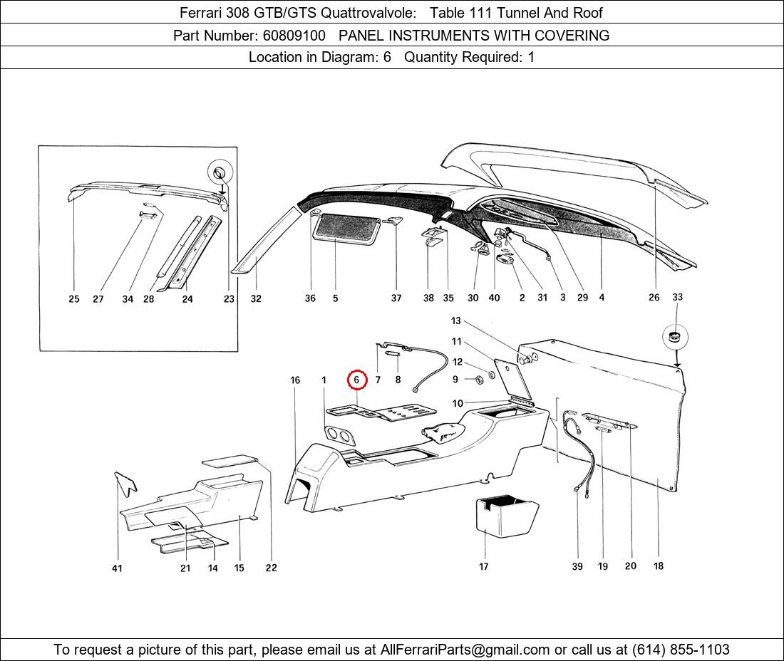 Ferrari Part Number 60809100, PANEL INSTRUMENTS WITH COVERING shown here as used in Ferrari 308 GTB/GTS Quattrovalvole Table 111 Tunnel And Roof. Location in Diagram: 6. Required Quantity: 1