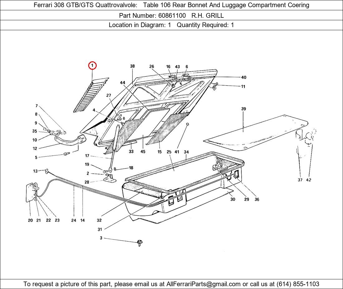 Ferrari Part Number 60861100, R.H. GRILL shown here as used in Ferrari 308 GTB/GTS Quattrovalvole Table 106 Rear Bonnet And Luggage Compartment Coering. Location in Diagram: 1. Required Quantity: 1