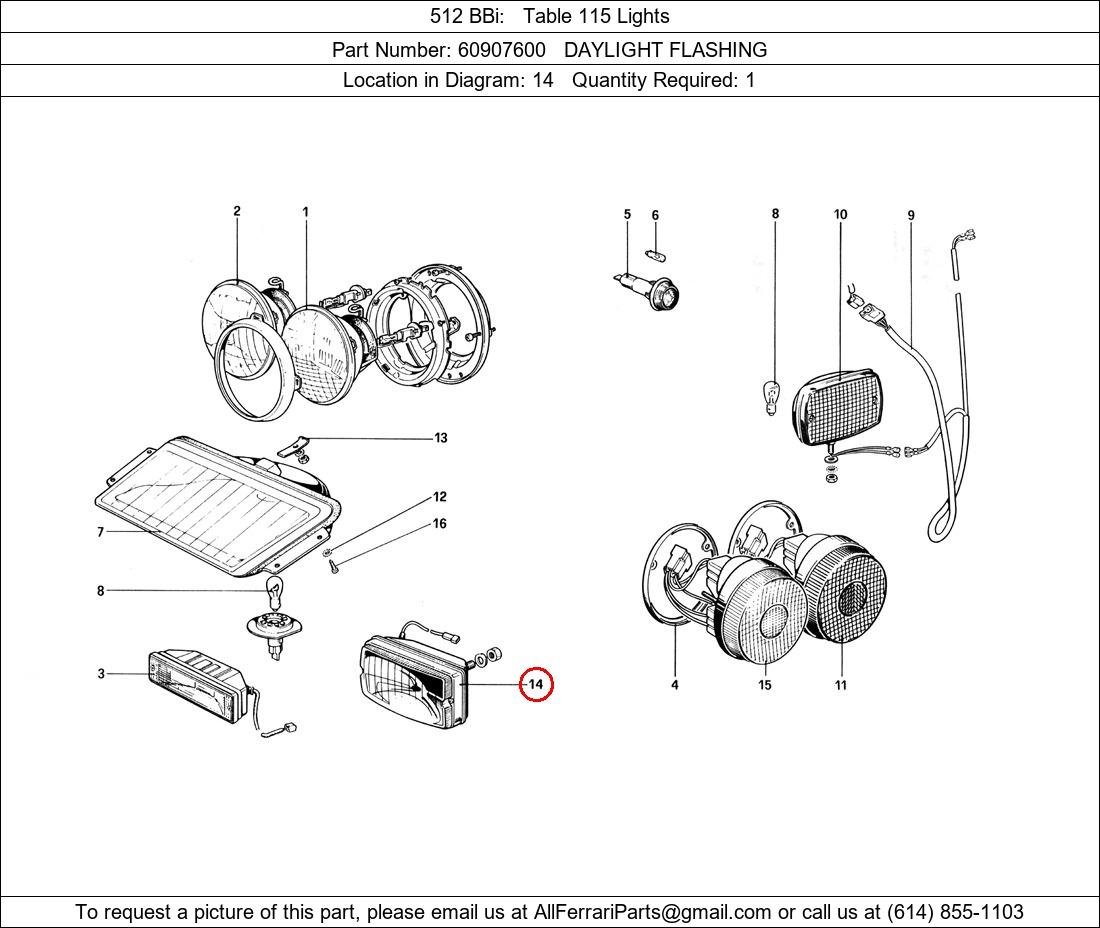 Ferrari Part Number 60907600, DAYLIGHT FLASHING shown here as used in 512 BBi Table 115 Lights. Location in Diagram: 14. Required Quantity: 1. This Ferrari part is used in more than one diagram. Click on the diagrams below to see alternative uses of this part: