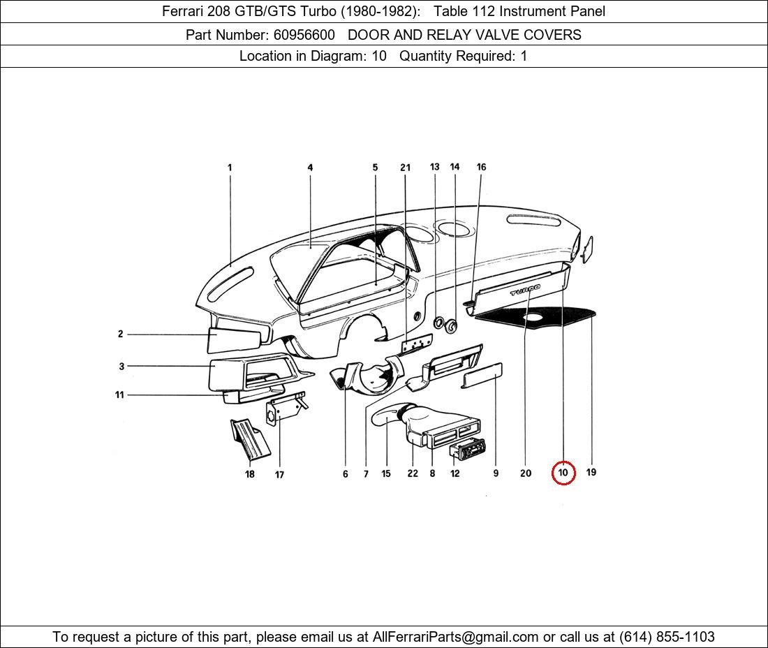 Ferrari Part Number 60956600, DOOR AND RELAY VALVE COVERS shown here as used in Ferrari 208 GTB/GTS Turbo (1980-1982) Table 112 Instrument Panel. Location in Diagram: 10. Required Quantity: 1