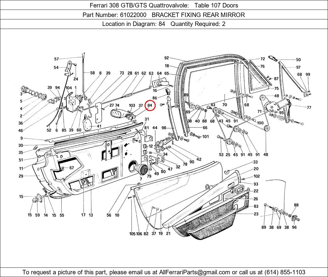 Ferrari Part Number 61022000, BRACKET FIXING REAR MIRROR shown here as used in Ferrari 308 GTB/GTS Quattrovalvole Table 107 Doors. Location in Diagram: 84. Required Quantity: 2. This Ferrari part is used in more than one diagram. Click on the diagrams below to see alternative uses of this part: