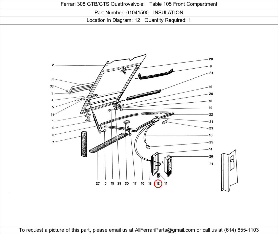 Ferrari Part Number 61041500, INSULATION shown here as used in Ferrari 308 GTB/GTS Quattrovalvole Table 105 Front Compartment. Location in Diagram: 12. Required Quantity: 1