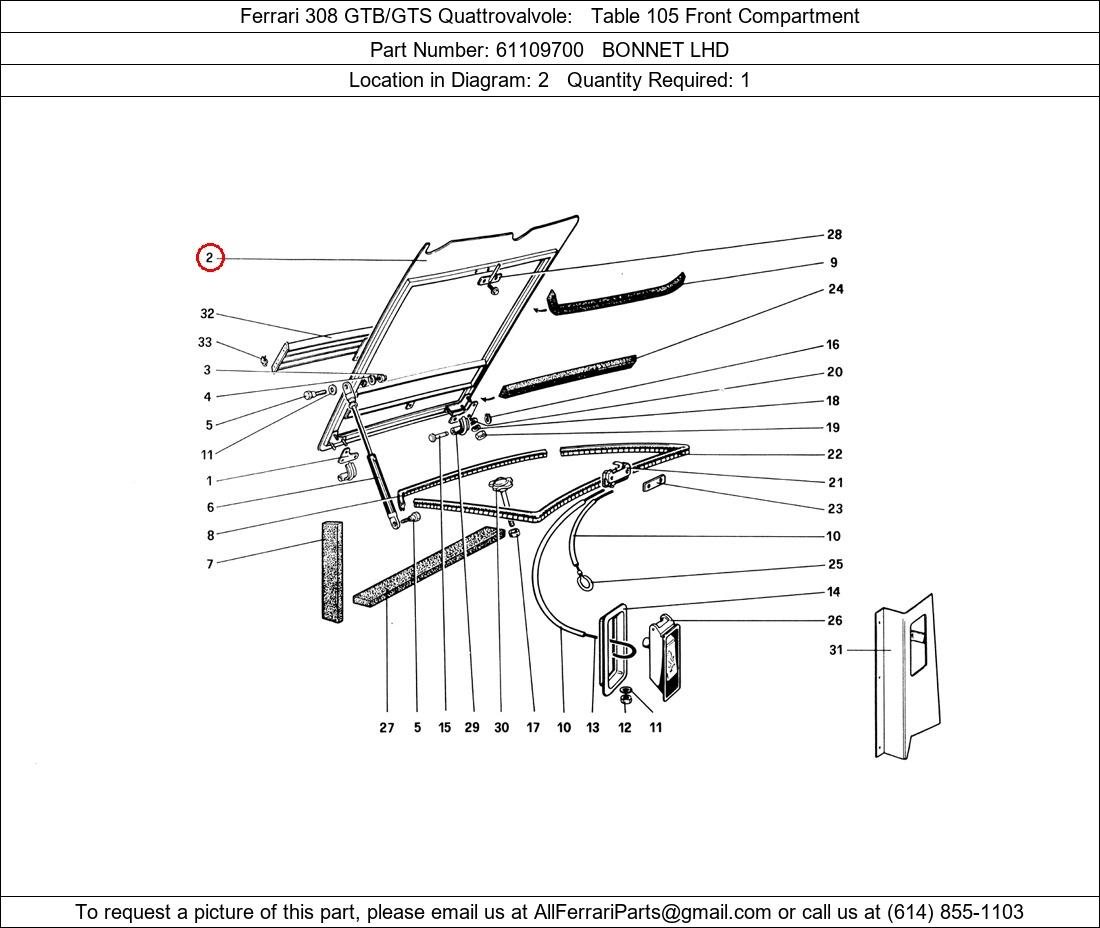 Ferrari Part Number 61109700, BONNET LHD shown here as used in Ferrari 308 GTB/GTS Quattrovalvole Table 105 Front Compartment. Location in Diagram: 2. Required Quantity: 1