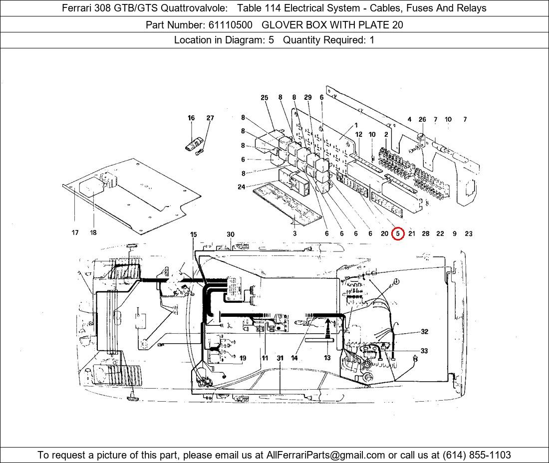 Ferrari Part Number 61110500, GLOVER BOX WITH PLATE 20 shown here as used in Ferrari 308 GTB/GTS Quattrovalvole Table 114 Electrical System - Cables, Fuses And Relays. Location in Diagram: 5. Required Quantity: 1. This Ferrari part is used in more than one diagram. Click on the diagrams below to see alternative uses of this part: