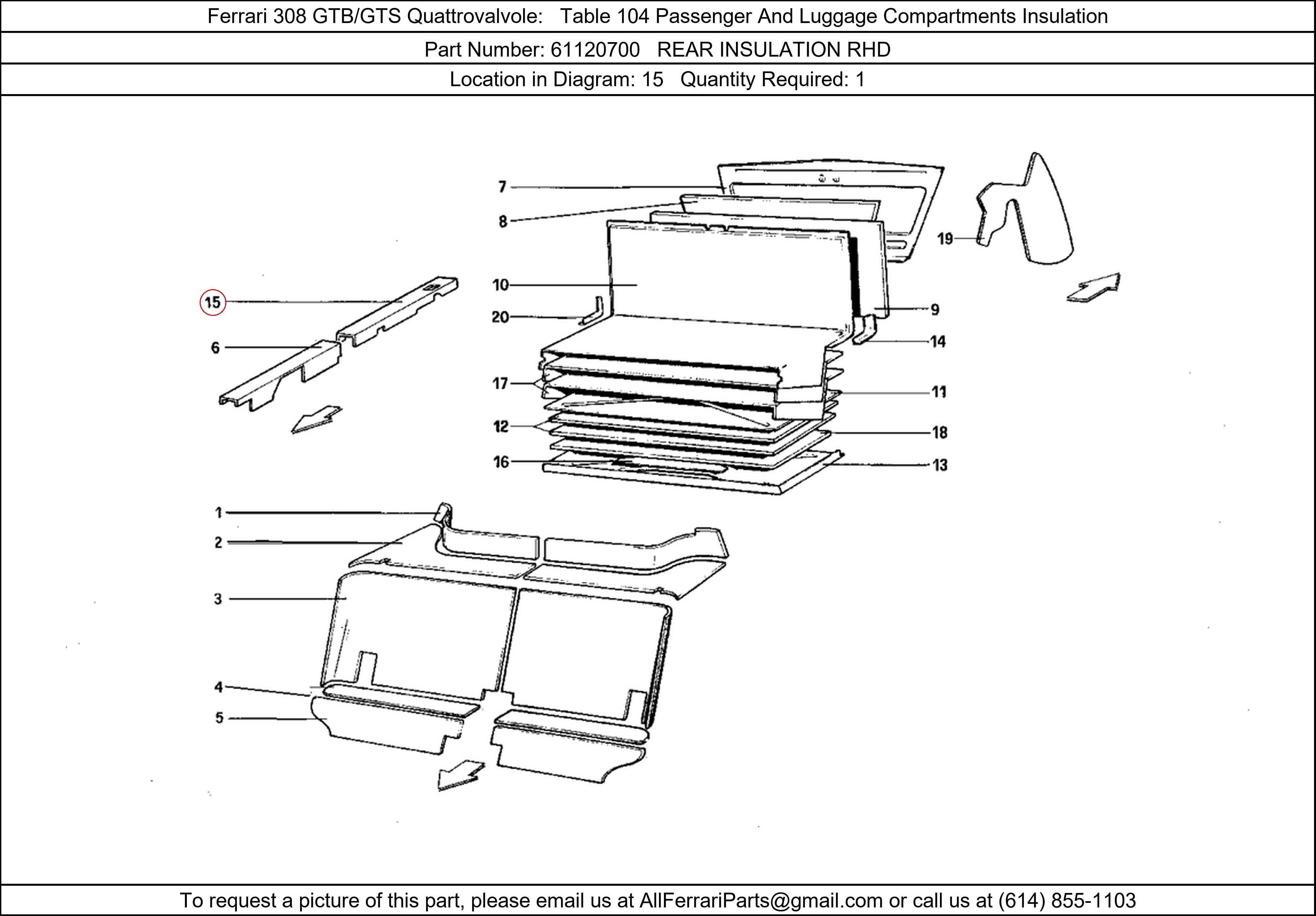 Ferrari Part Number 61120700, REAR INSULATION RHD shown here as used in Ferrari 308 GTB/GTS Quattrovalvole Table 104 Passenger And Luggage Compartments Insulation. Location in Diagram: 15. Required Quantity: 1