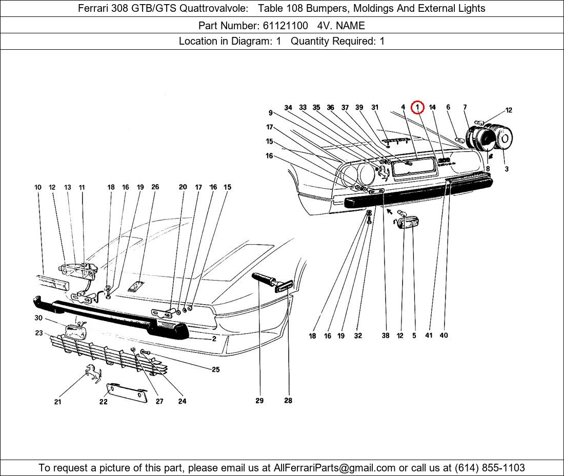 Ferrari Part Number 61121100, 4V. NAME shown here as used in Ferrari 308 GTB/GTS Quattrovalvole Table 108 Bumpers, Moldings And External Lights. Location in Diagram: 1. Required Quantity: 1. This Ferrari part is used in more than one diagram. Click on the diagrams below to see alternative uses of this part: