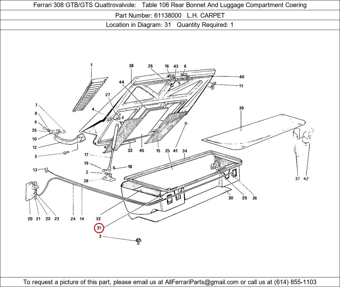 Ferrari Part Number 61138000, L.H. CARPET shown here as used in Ferrari 308 GTB/GTS Quattrovalvole Table 106 Rear Bonnet And Luggage Compartment Coering. Location in Diagram: 31. Required Quantity: 1. This Ferrari part is used in more than one diagram. Click on the diagrams below to see alternative uses of this part: