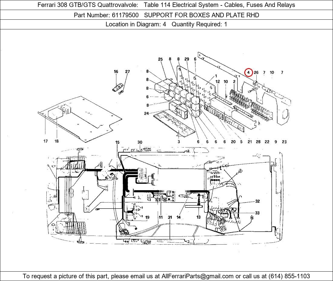 Ferrari Part Number 61179500, SUPPORT FOR BOXES AND PLATE RHD shown here as used in Ferrari 308 GTB/GTS Quattrovalvole Table 114 Electrical System - Cables, Fuses And Relays. Location in Diagram: 4. Required Quantity: 1